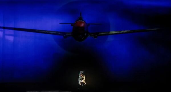 “本剧情景多、变化频繁、多时空并列,迁换需要快速高效。”丁丁介绍,为此,他在舞台三分之一深处,设置了一组可以开合的“云”景片,在深度上分割舞台空间,功能上则保证前区演出时后区换景的遮挡需要,“云开云合”完成瞬间的空间重组、传递信息和情感,增强艺术感和观赏性;加之现场以冷峻的钢铁结构象征战争的残酷与男性的阳刚,配合多媒体技术营造空战的激烈效果,最终呈现出极具冲击力的视觉画面。