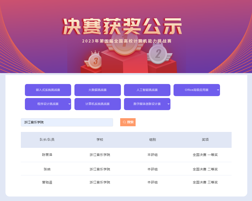 在近日结束的第五届全国高校计算机能力挑战赛中,学院学子喜获佳绩,在Office高级应用赛中斩获全国决赛奖项3项。其中,音乐工程系陈誉泽同学获一等奖,音乐教育学院张响同学获二等奖,音乐学系曾驰遥同学获三等奖。