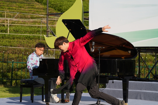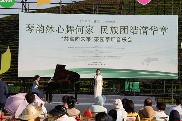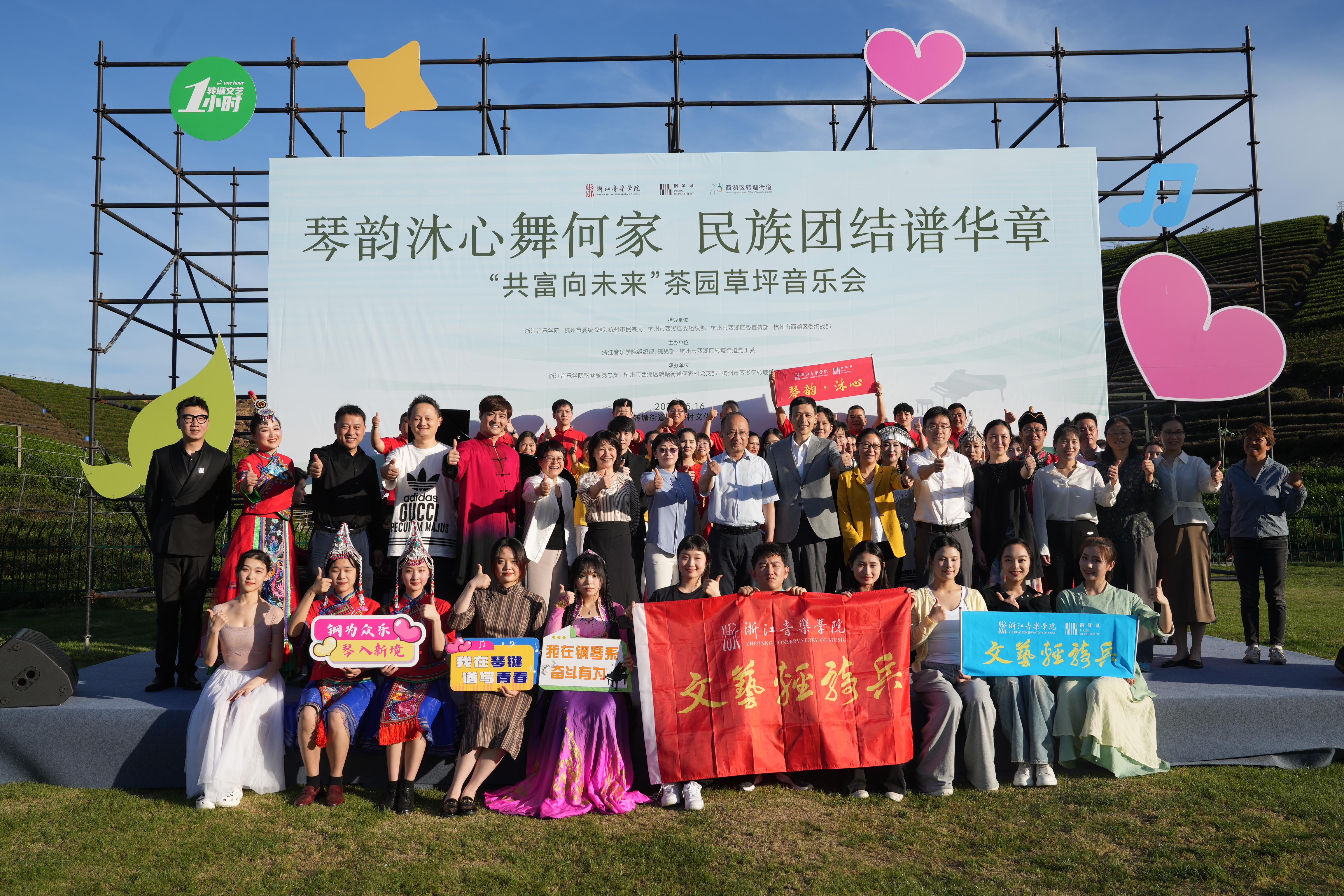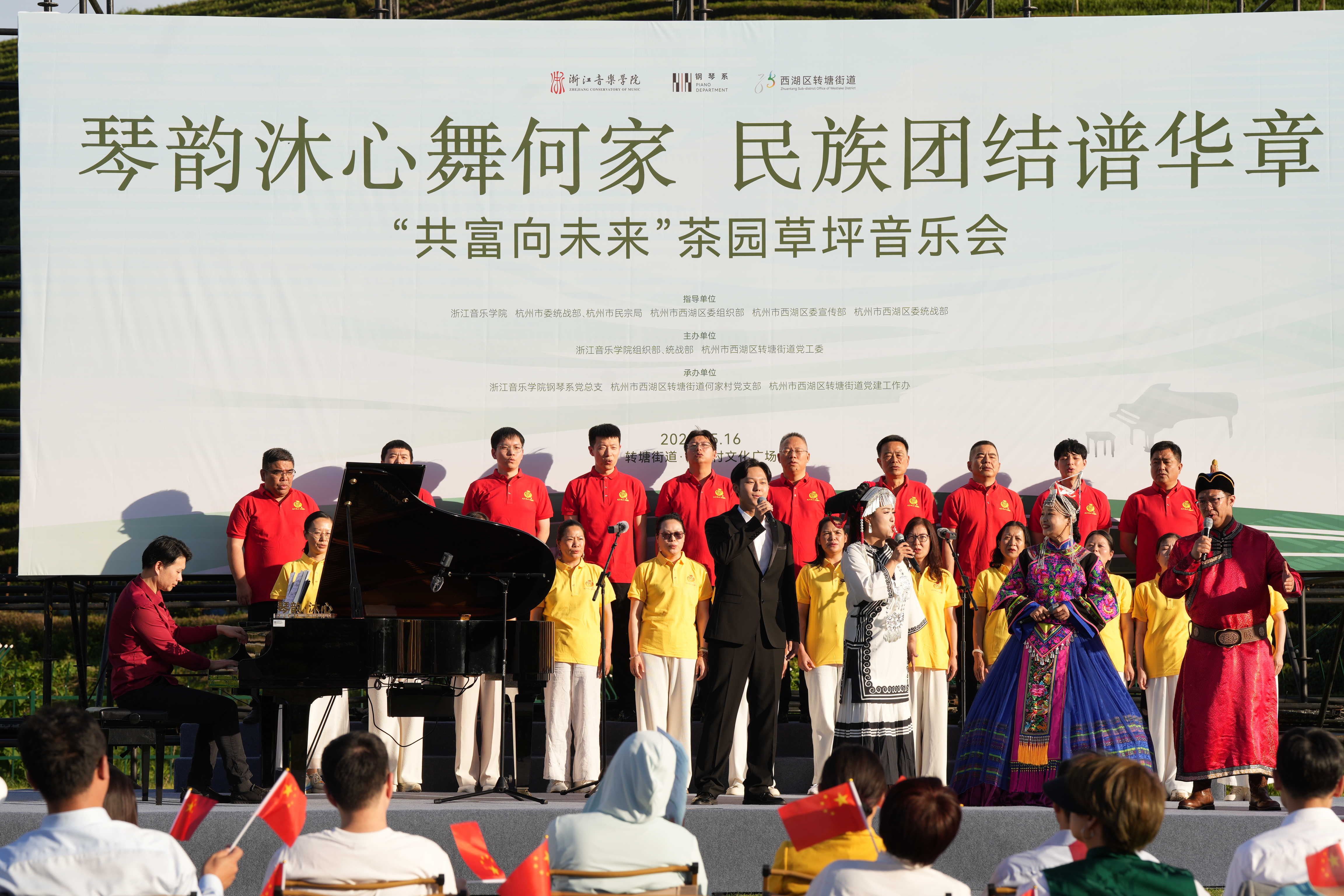 随后,钢琴独奏《中国之梦》、流行演唱《如愿》《稻香》、二胡与钢琴《赛马》、二重唱《阡陌江南》等多首耳熟能详的乐曲相继上演。作为何家村“艺术村长”的刘福洋,也与钢琴系教授陈琼共同演绎了舞蹈与钢琴节目《鸿雁》,并带领村民共舞。转塘街道“石榴红”合唱团也首次亮相,一曲《之江同心石榴红》收获了全场的热烈掌声。最后,音乐会在浙音师生与转塘街道“石榴红”合唱团共同演唱的《我和我的祖国》中落下帷幕。在生机盎然的茶山下、翠绿松软的草坪中,欢乐与音符共振,生动展现了一幅和谐美好的茶乡画卷。