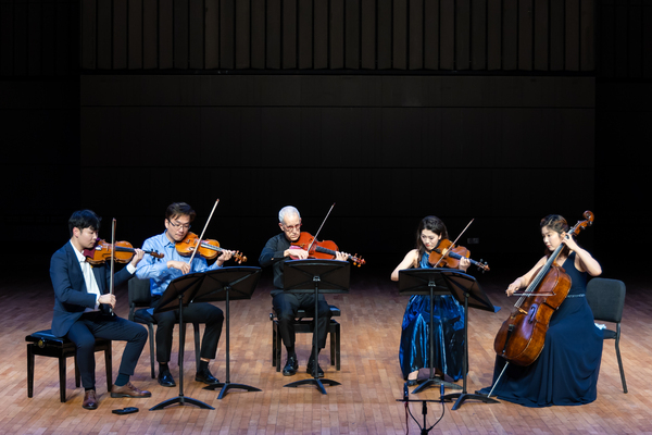 音乐会的下半场,特南博姆与“杭州四重奏”联合呈现了德沃夏克的《降E大调第三弦乐五重奏》。在处理音乐的和声、织体以及声部层次方面,各主题在保持自身特性的同时,巧妙地融合、构建了一个有序且层次清晰的音乐景象。艺术家们对作品中的不同变奏技巧的精准运用,不仅展现了他们各自卓越的演奏技巧,也深刻体现了对音乐深意的洞察力和独到见解。他们的演奏不仅准确捕捉到了德沃夏克音乐中的丰富情感色调,还细腻地呈现了室内乐主题的微妙转变,使演绎既充满活力又不失细腻与精致。