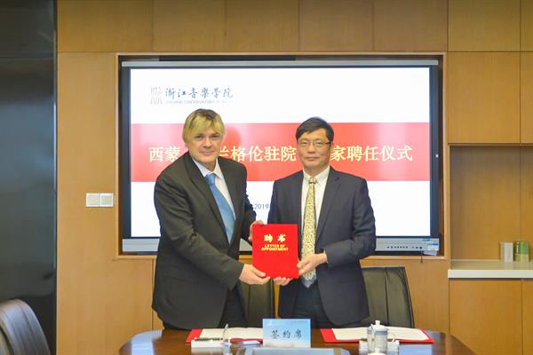 胡建新与西蒙•弗兰格伦先生共同签订《国际高端人才引进框架协议》并授予聘书。