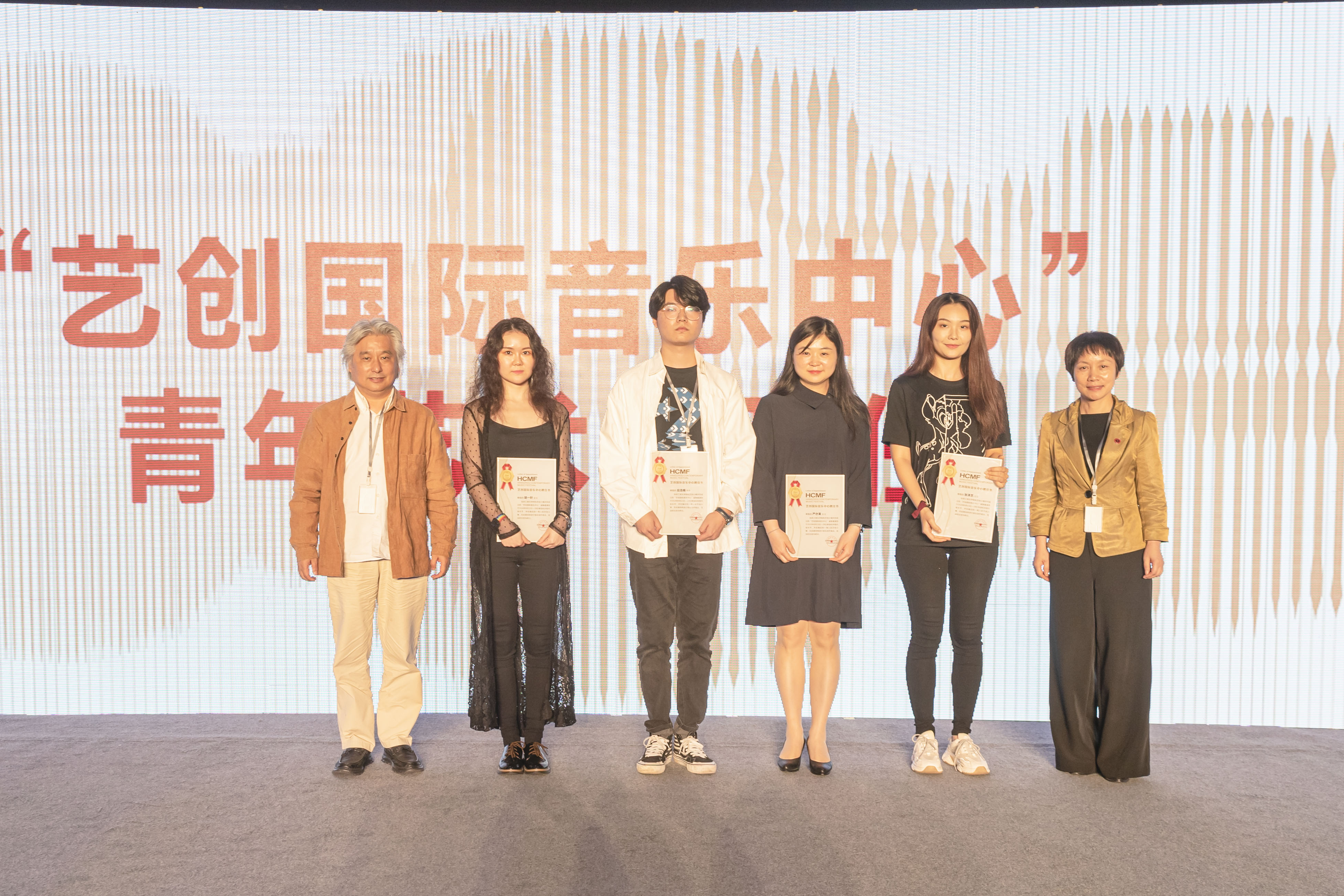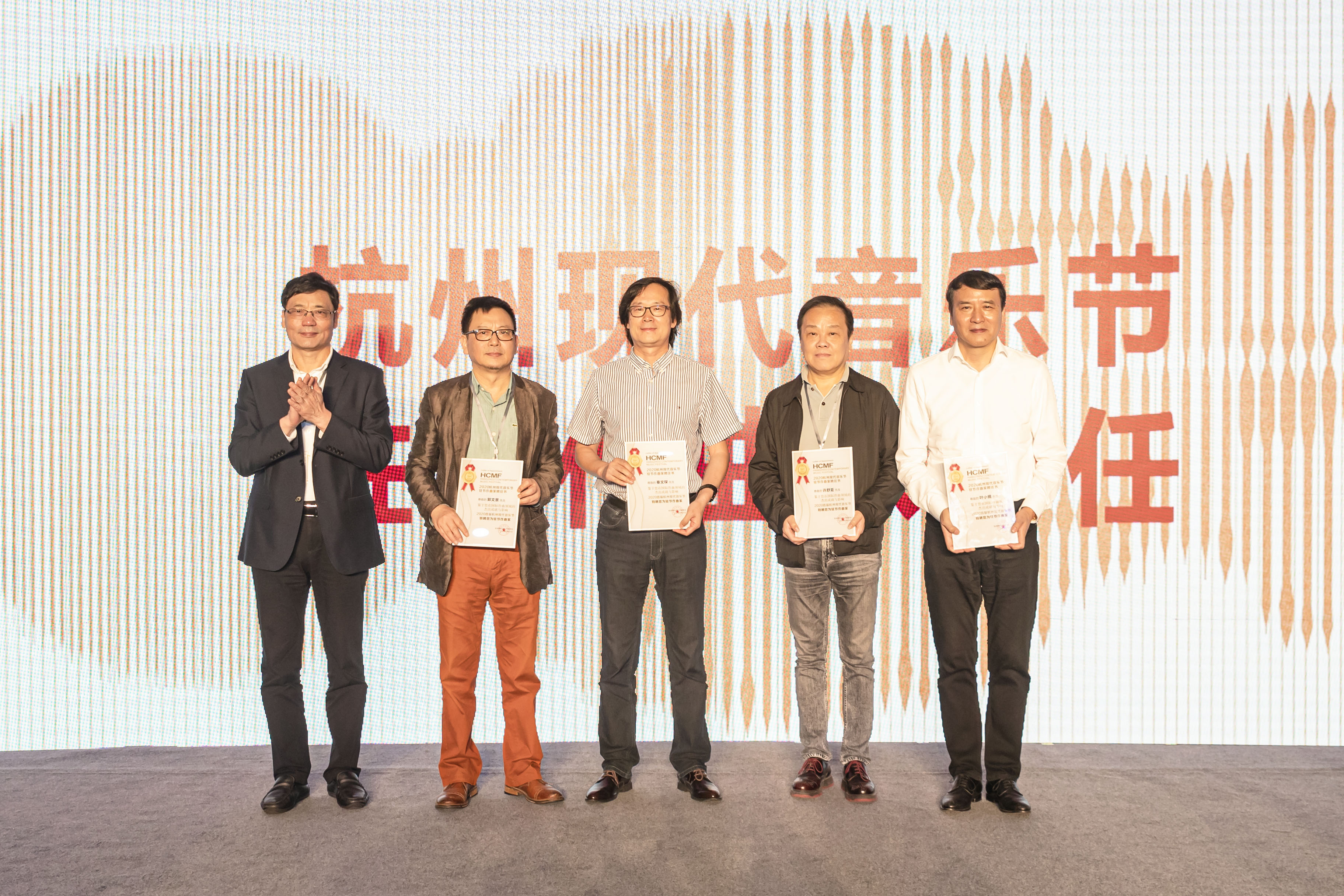 校党委书记胡建新为2020杭州现代音乐节驻节作曲家叶小纲、许舒亚、秦文琛、郭文景颁发证书。