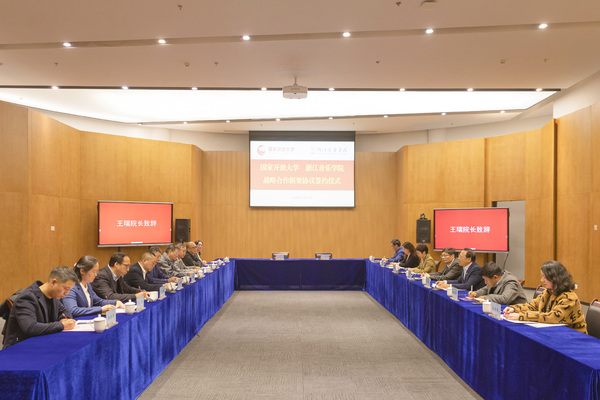 王瑞首先代表学校对国家开放大学领导一行的到来表示热烈欢迎,并介绍了学校在学科专业、人才培养、师资队伍、艺术创作、教学改革等方面所推进的一系列创新举措和建设成果。他指出,国家开放大学作为一所新型高等学校,有着丰富的教学资源、人才资源、社会资源、成熟的远程开放教育办学体系和覆盖全国的公共服务平台优势,是我国集中力量发展终身教育、补齐“构建服务全民终身学习的教育体系”短板的一项重要创举。两校的战略合作将进一步推动双方特色优质教育资源的整合与开放教育体系的构建,进一步增强双方综合办学实力与社会影响力,推动两校的高水平建设和高质量发展。