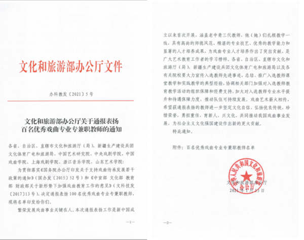 近日,文化和旅游部发布《文化和旅游部办公厅关于通报表扬百名优秀戏曲专业专兼职教师的通知》(办科教发〔2021〕5号),学院戏剧系教师金彩芳、兼职教师胡山岗受到通报表扬。