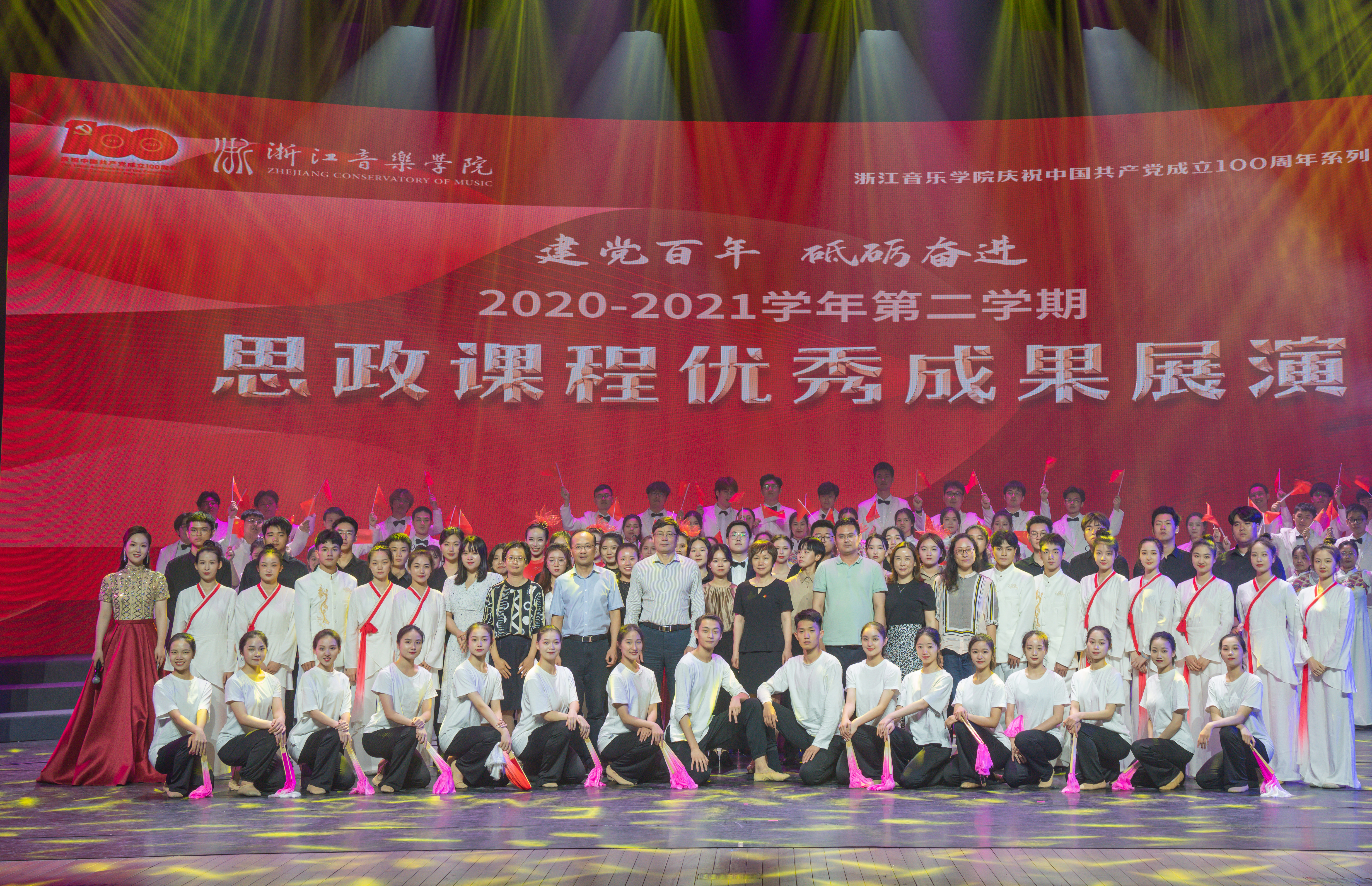6月9日下午,学院庆祝中国共产党成立100周年系列主题活动——“建党百年 砥砺奋进”2020-2021学年第二学期思政课程优秀成果展演在学院九五剧场举办。此次展演聚焦建党百年主题,以思政课堂为抓手,紧紧围绕建党百年的辉煌历程和中国梦历史行程,将“建党百年”“党史学习教育”充分融入其中。展演由宣传部、马克思主义学院、艺术处主办,人文社会科学部协办。学院党政领导班子成员胡建新、贾秀英、李俊出席活动。