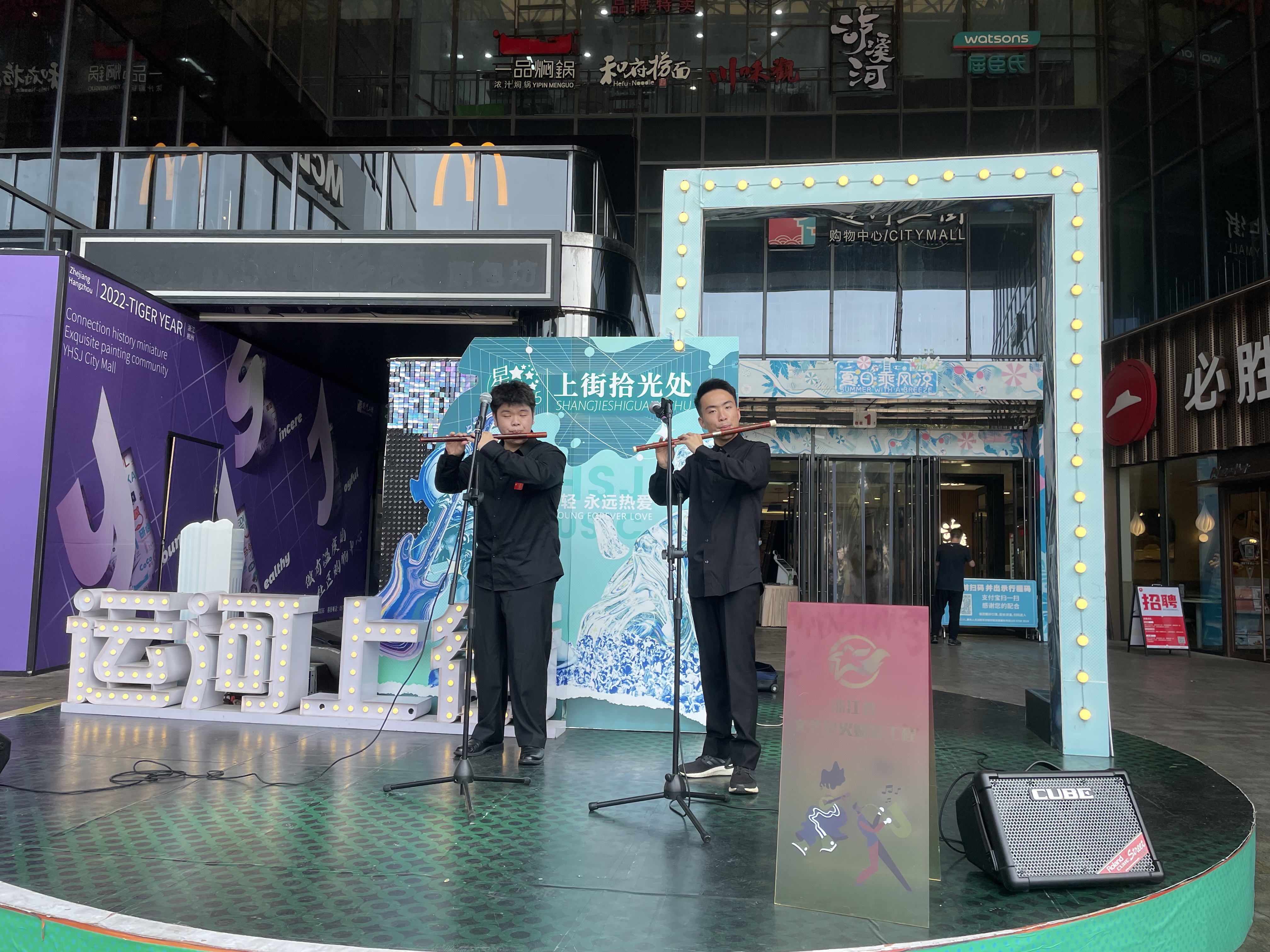 在湖滨银泰湖上乐客厅,3位钢琴系的“文艺轻骑兵”为市民带来悠扬华美的乐章。其中,研究生明亮师从金钟奖得主朱昊老师、本科生宗敬博师从金钟奖得主陈小雨老师。他们面朝西湖,指尖在琴键上流淌,向广大市民演绎了储望华先生创作的钢琴独奏曲《“茉莉花”幻想曲》等中西经典之作,不仅展现了浙音学长高超的钢琴技巧,更为美丽西湖平添了音乐的亮色。