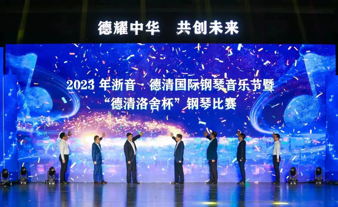 启动仪式上,学校和德清双方领导上台共同启动了2023浙音·德清国际钢琴音乐节暨“德清洛舍杯”钢琴比赛大屏。