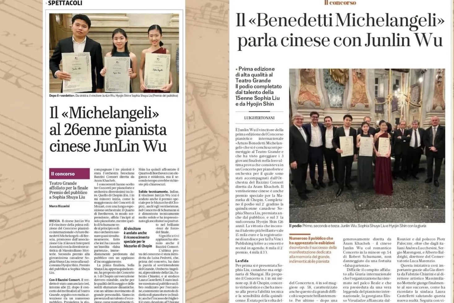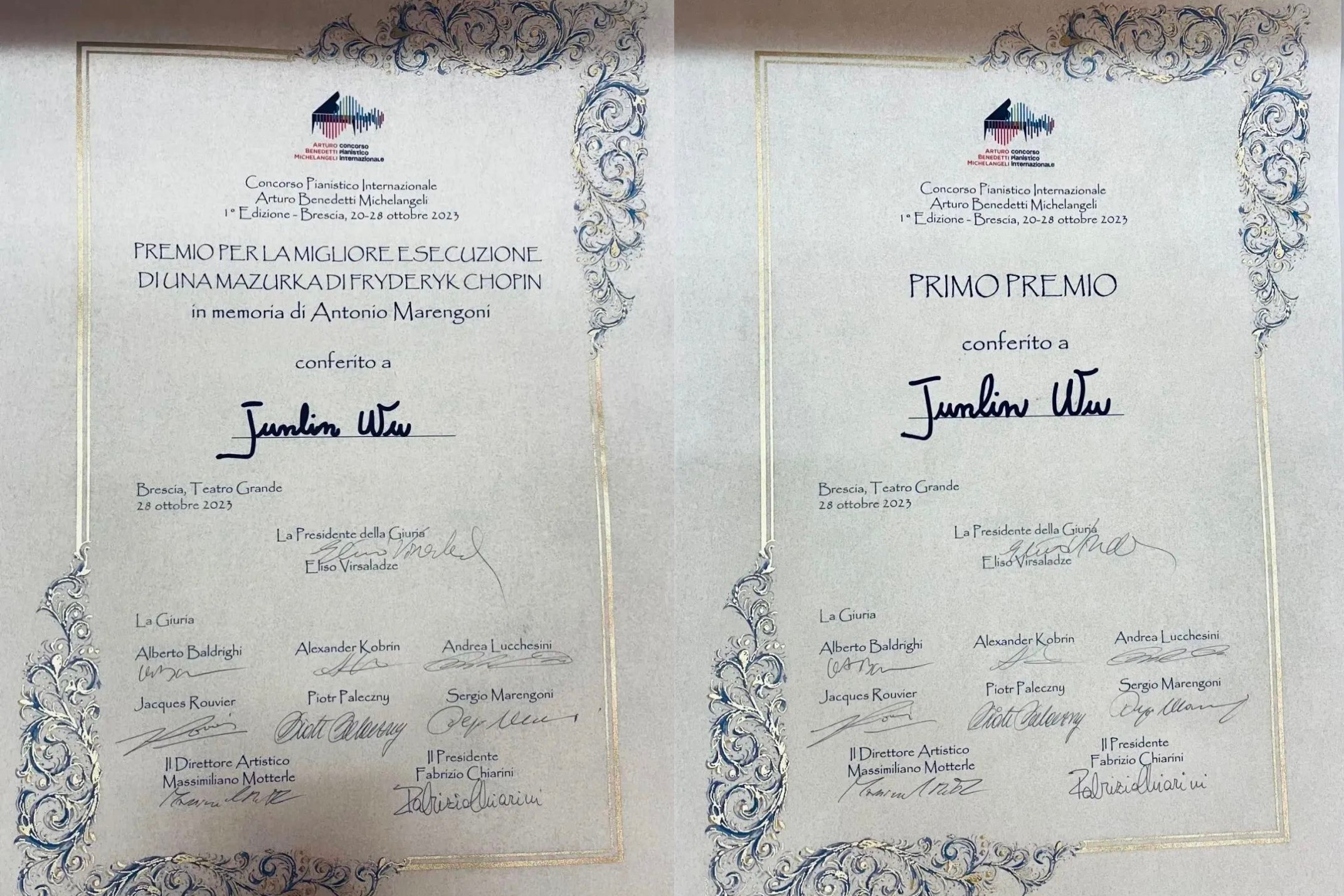 第一届米开朗杰利国际钢琴比赛由意大利公益组织Giovani Interpreti Associati(Young Interpreters Association)主办,由数位国际顶尖钢琴家、钢琴教育家担任评委。大赛汇聚了来自世界各地的一流音乐家参赛,在选手组成规模、比赛规定时长、轮次和曲目设置、评委阵容等方面,均达到了国家文化部评定的国际A类赛事级别。在此次比赛中,吴君麟与来自世界各地的36名优秀钢琴家同台竞技,历经四轮激烈的角逐,最终以精湛的技艺和卓越的才华打动了现场评审团,斩获赛事第一名和最佳肖邦玛祖卡奖,同时还赢得2024年、2025年欧洲巡演钢琴独奏会、意大利布雷西亚交响乐团乐季开幕式演出,以及与达芬奇唱片公司合作录制专辑等机会。此次获奖是学院钢琴系近年来所取得的最高规格、最高标准的国际权威赛事冠军。